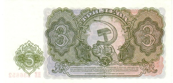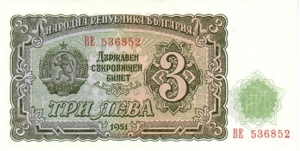 Obverse | Deep olive-green on green and orange underprint. 3 at right, arms at left. A shield with the inscription “НРБ” (People’s Republic of Bulgaria) on the wider white margin |