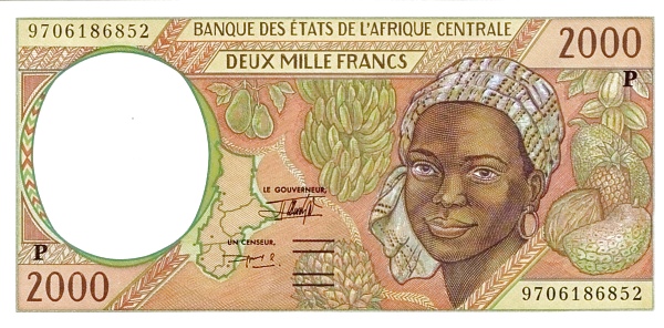 Obverse | Woman’s head at right, surrounded by tropical fruit at center, Map of Central African states at lower left center. |