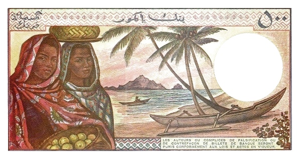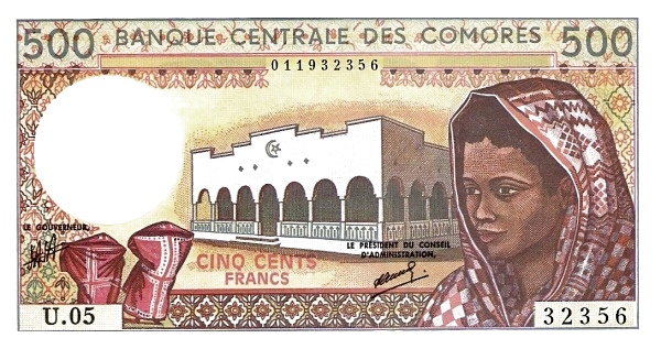 Obverse | Old government administrative building on Mohéli island (or Mutsamudu, Anjouan). Woman wearing a head scarf. Shiromani – traditional Comorian attire |