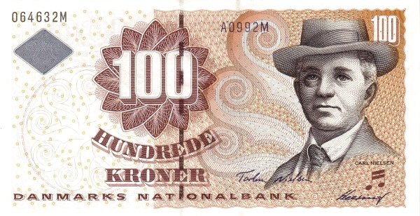 | Security features | Black hidden Security thread. Partly wisibel metalic security thread ”window thread” with ”100 KR” Microprint. On the Obverse is ”100 KR” printet around the watermark in microprint, and several other places microprint is used in different sizes. |