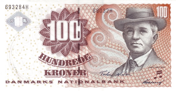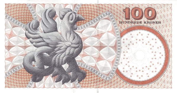 Security features | Black hidden Security thread. Partly wisibel metalic security thread ”window thread” with ”100 KR” Microprint. On the Obverse is ”100 KR” printet around the watermark in microprint, and several other places microprint is used in different sizes. |