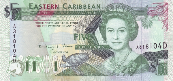 Obverse | Queen Elizabeth II, ECCB building, Turtle, Green-throated Carib (Eulampis jugularis), and Fishes |