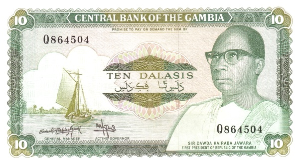 | Obverse | Sailing boat. President Sir Dawda Kairaba Jawara – First President of Republic of the Gambia |