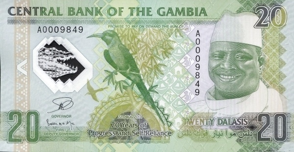 Obverse | Carmine bee eater; President Sheikh Professor Alhaji Dr. Yahya Abdul-Aziz Jemus Junkung Jammeh (formerly Yahya Alphonse Jemus Jebulai Jammeh) |