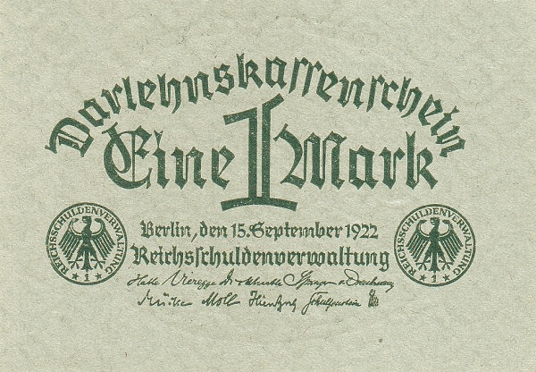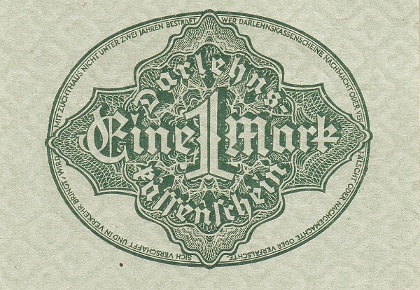 Remark | „Darlehenskassenscheine“ were banknotes issued between 1914 and 1922 by the Reichsschuldenverwaltung (Reich debt administration). They were in use until the hyperinflation in 1923. These banknotes were not legal tender, however they had to be accepted by all public treasuries. Their value was guaranteed by loans on industrial and agricultural goods. Even without the status as legal tender Darlehenskassenscheine were a de facto currency widely used as a parallel currency to the Goldmark during WWI and the beginning of the Weimar Republic. |