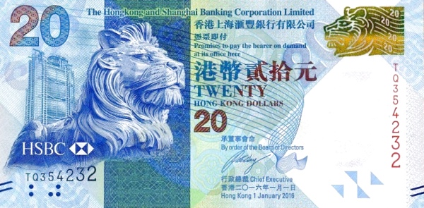 Hong Kong P-212e / 20 Dollars 2016 – UNC