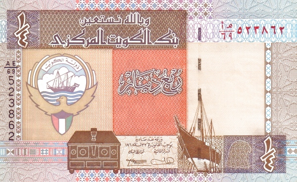 | Security features | Security Thread: A shiny silver metallic thread that appears as a series of vertical disconnected dashes at the front. When the banknote is held against light, the thread appears as a solid line. Microlettering: A micro-text line in which the title of ‘Central Bank of Kuwait’ is repeated in Arabic at the front, and in English at the back of the banknote. Latent Image: Vignette of a Kuwaiti Chest is used as supporting ornament to carry the latent image which represents the Value Numeral “1/4”. It becomes visible when the note is held up to the light and is tilted up and down at an acute angle at eye level. |