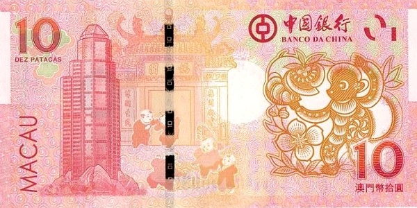 Remark Between 2012-2023, the Banco Nacional Ultramarino and the Banco da China issued one banknote of 10 Patacas every year, to celebrate the Chinese Lunar Year. The banknotes have a similar basic design and differ in the bank names, the bank building on reverse and the respective zodiac animal of the year of issue. The zodiac animals on the reverse are printed in different colours.