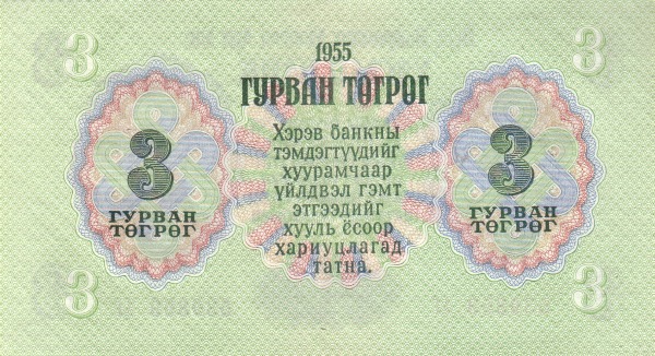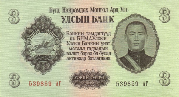 Mongolia P-29 / 3 Tugrik 1955 – aUNC