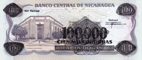 Nicaragua P-159x / 100,000 Cordobas 1989 – UNC (error – overprint only on back)