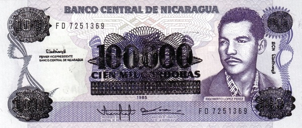 Nicaragua P-159x / 100,000 Cordobas 1989 – UNC (error – overprint only on front)