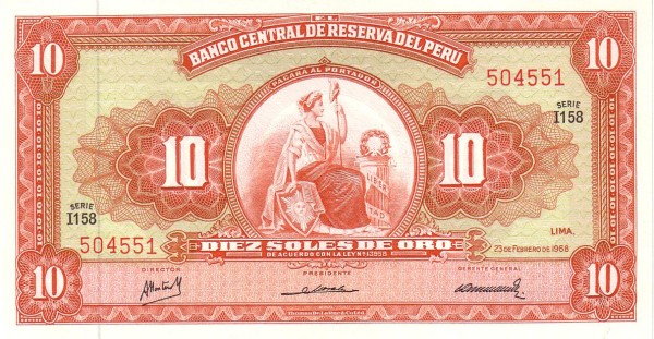Peru P 84 / 10 Soles de Oro 1968 – UNC