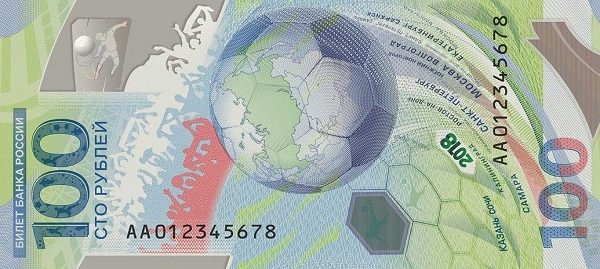 Reverse | Stylized Russian flag with silhouettes of athletic fans; stylized globe on soccer ball with Russian Federation map; names of Russian cities hosting playoff games (Ekaterinburg, Kaliningrad, Kazan, Moscow, Nizhniy-Novgorod, Rostov-na-Donu, Samara, Sankt-Petersburg, Saransk, Sochi, Volgograd) |